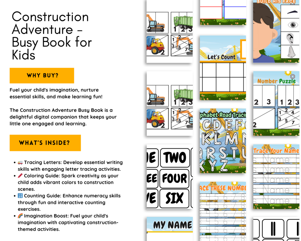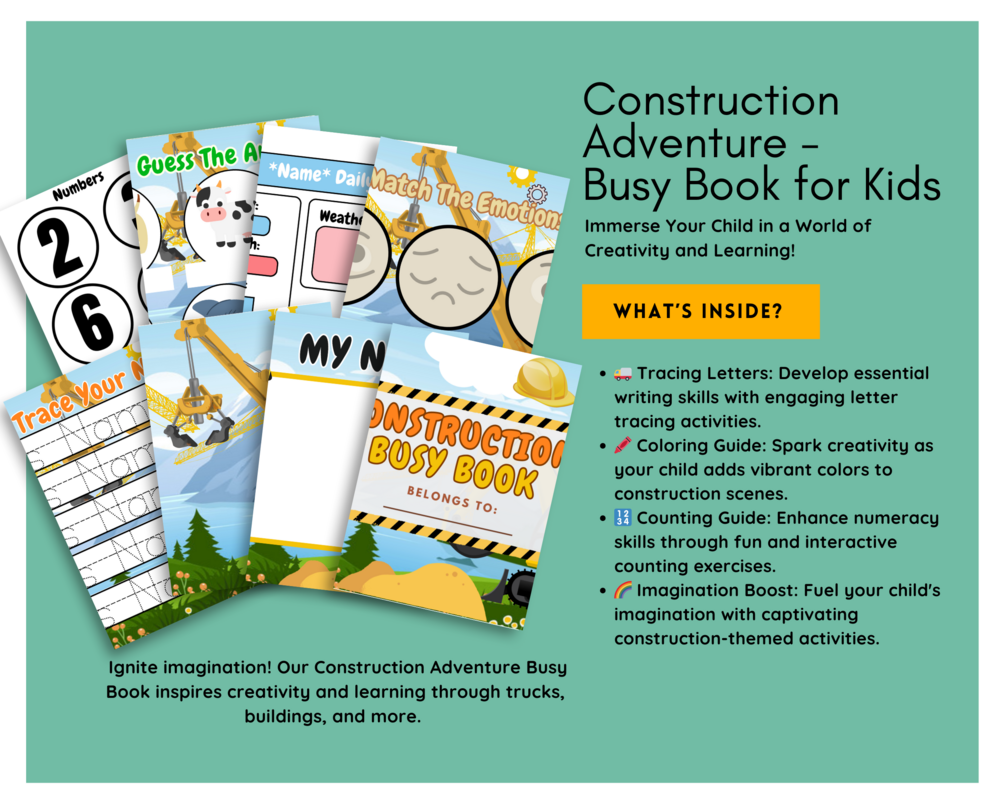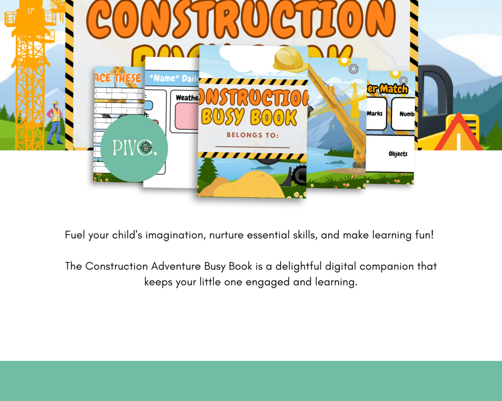 Fuel your child's imagination, nurture essential skills, and make learning fun! The Construction Adventure Busy Book is a delightful digital companion that keeps your little one engaged and learning.
