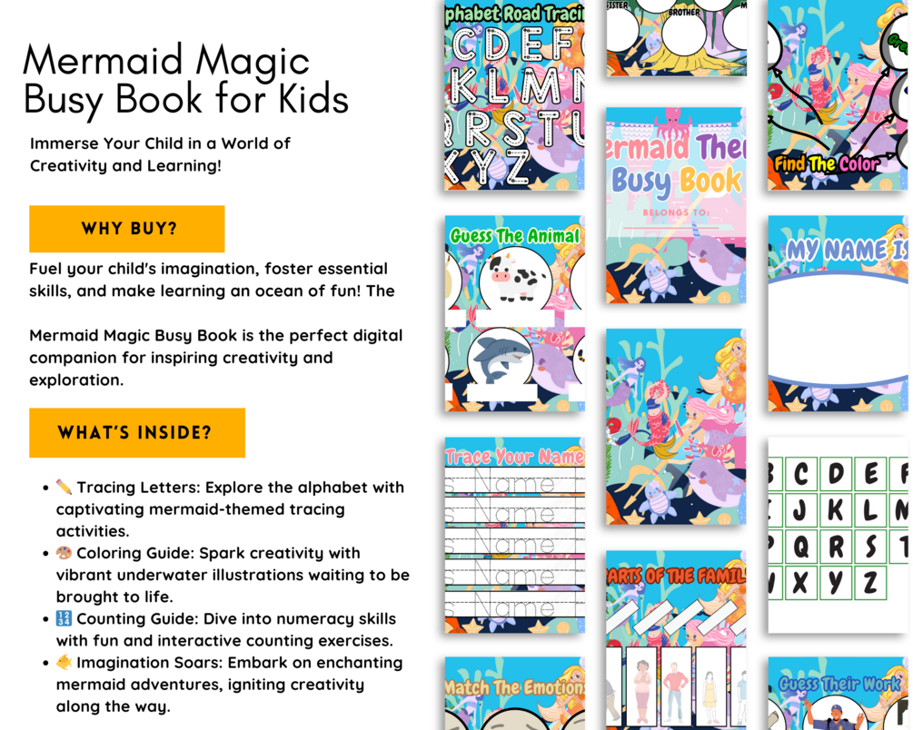 Fuel your child's imagination, foster essential skills, and make learning an ocean of fun! The Mermaid Magic Busy Book is the perfect digital companion for inspiring creativity and exploration.