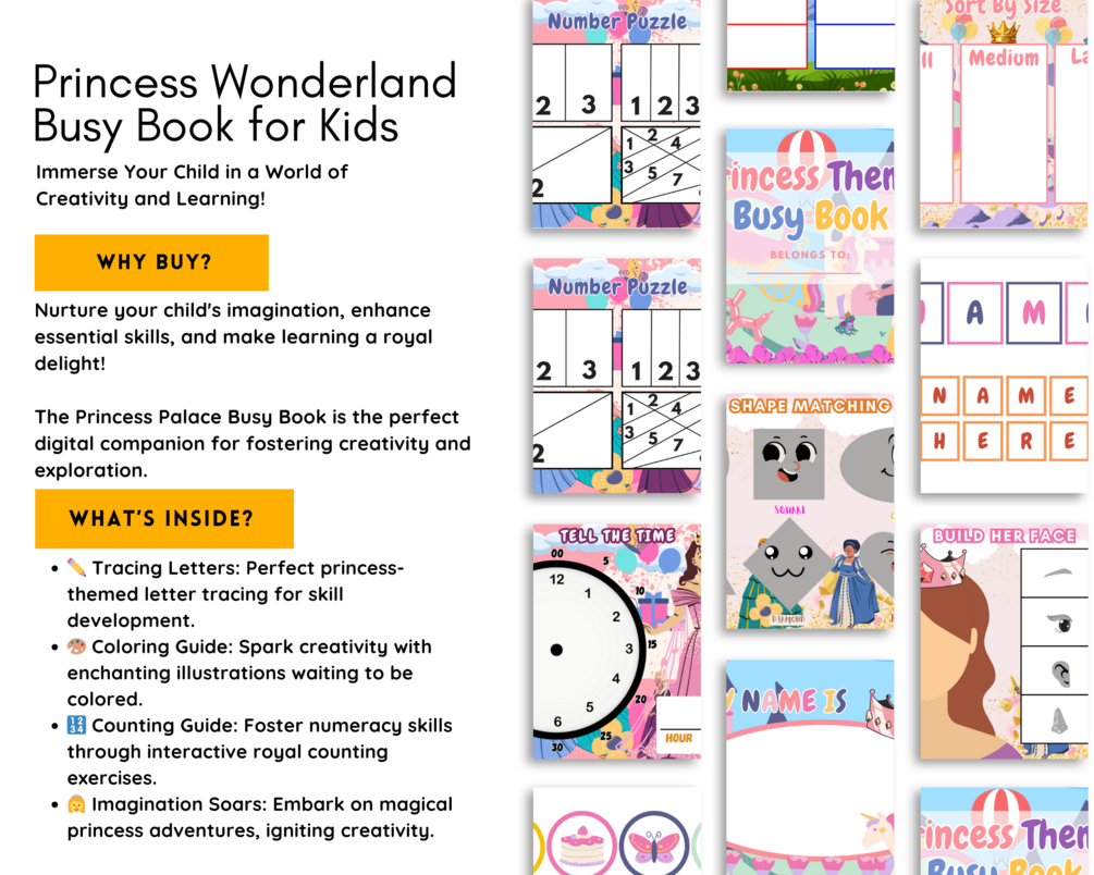 Nurture your child's imagination, enhance essential skills, and make learning a royal delight! The Princess Palace Busy Book is the perfect digital companion for fostering creativity and exploration.